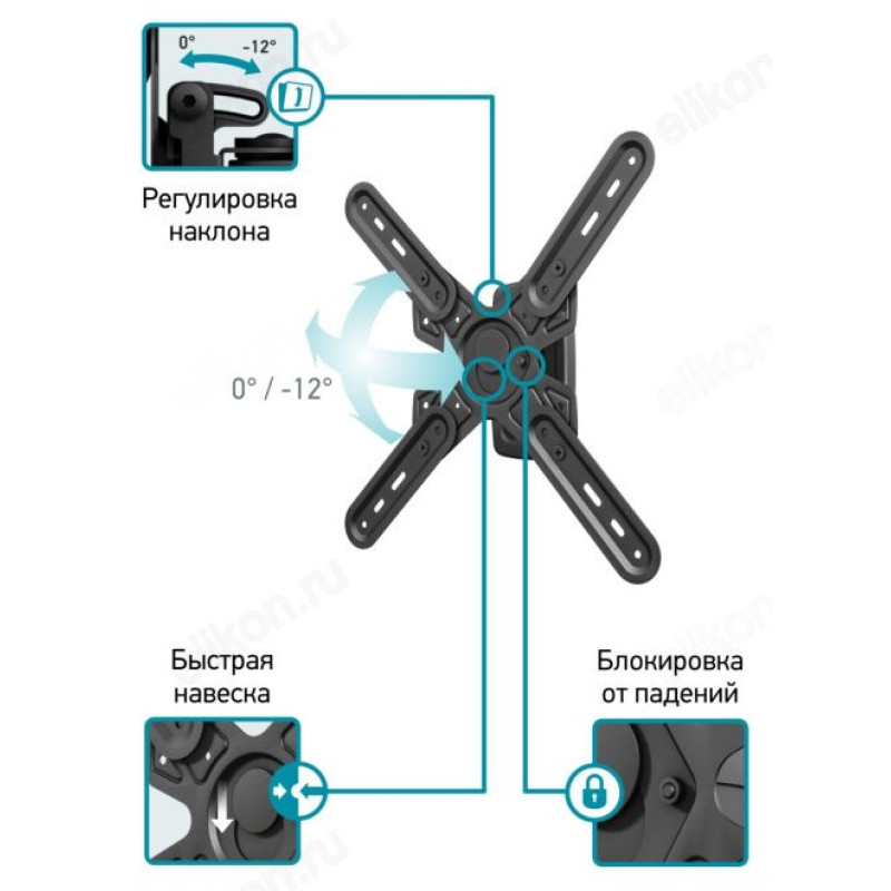 Регулировка от 0 до -12 градусов позволит выбрать оптимальный угол наклона телевизора, расстояние от стены составляет 90 мм.