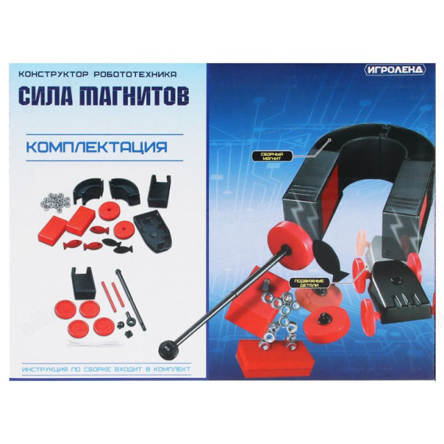 Конструктор робототехника от «Игроленд» «Сила магнитов» познакомит ребёнка с моделированием, а также покажет на практике, как работают магниты. В комплекте находятся детали для сборки магнита и предметы с металлическими вставками для его испытаний. Игрушка будет интересна для детей от 6 лет и станет первым шагом на пути к познанию естественных наук.• Более 40 деталей; • множество экспериментов; • сборный магнит; • инструкция по сборке входит в комплект; • для сборки нужна отвертка ( не входит в комплект) .