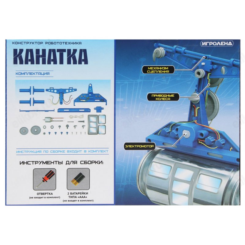 Ребёнок увлекается конструированием? Подарите ему конструктор от «Игроленд» «Канатка» с электромотором. Конструктор предназначен для детей от 6 лет и после сборки работает, как настоящий фуникулёр. Имеет электромотор, приводные колеса и механизм сцепления. В комплект входит инструкция. Для сборки необходима отвертка и 2 батарейки типа AAA ( в комплект не входят) . Игрушка полезна для развития логики, интеллекта и пространственного мышления.• Более 30 деталей; • оснащён электромотором; • подвижные элементы; • потребуется жестяная банка ( кабина фуникулёра) , которая не входит в комплект; • инструкция по сборке ( входит в комплект) ; • для сборки нужна отвертка ( не входит в комплект) ; • для работы используйте 2 батарейки типа ААА ( не входят в комплект) .