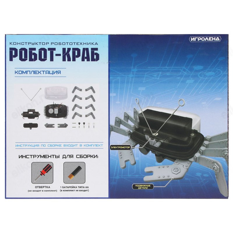 Ваш ребёнок увлекается робототехникой? Тогда подарите ему конструктор «Робот Краб» от «Игроленд» с электромотором. Комплект содержит подробную инструкцию по сборке и подойдет для детей старше 6 лет. Готовый робот имеет подвижные части и электромотор, который приводит его в движение. Для сборки необходима отвертка, а также 1 батарейка типа АА (в комплект не входят). Конструируя робота, ребёнок будет развивать воображение, внимательность, память, мелкую моторику рук и освоит основы механики.