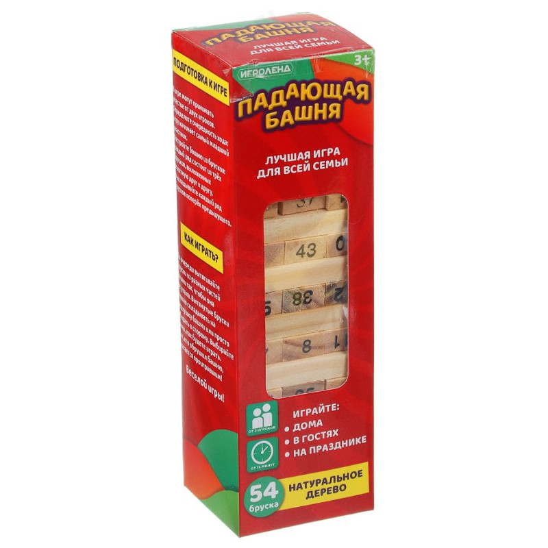 Предлагаем вам приобрести увлекательную настольную игру «Падающую башню». Это отличный способ провести время с азартом и интересом. Постройте башню из пронумерованных деревянных брусков. Каждый игрок по очереди бросает кубики, определяет число и ищет соответствующий брусок, который нужно аккуратно извлечь, чтобы не разрушить конструкцию. В классической версии игры вытянутый брусок помещается на верхний уровень башни. Игрок, который разрушит сооружение, считается проигравшим. Изготовлена из дерева, размеры: 5, 5х5, 5х18, 5 см.