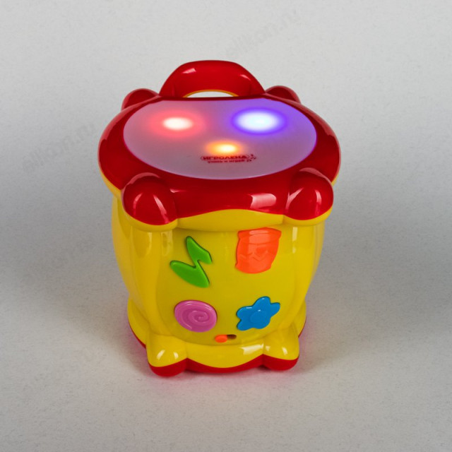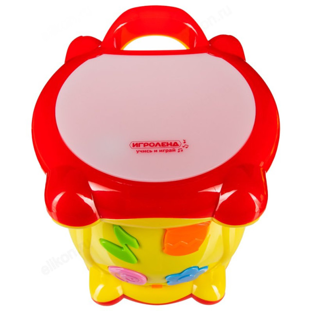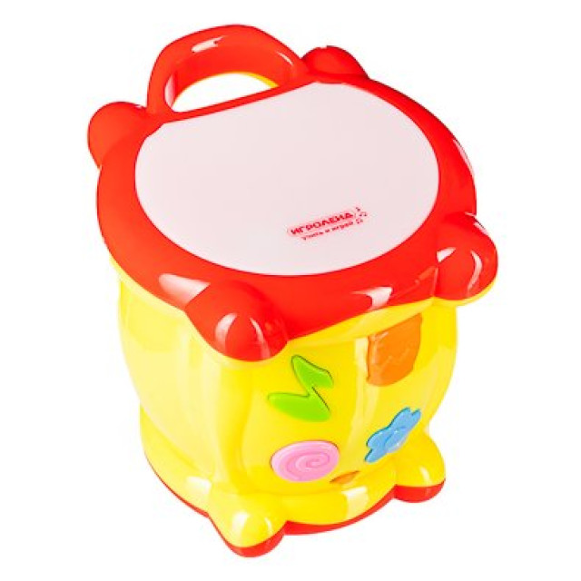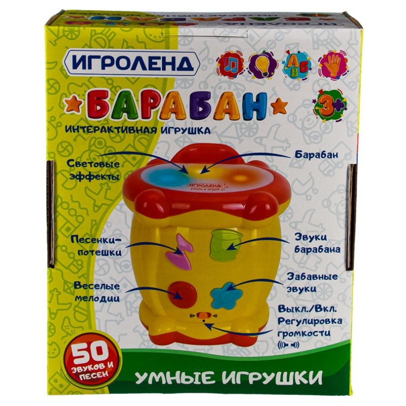Какой малыш не любит слушать веселые песенки и мелодии? Интерактивная игрушка «Барабан» от ИГРОЛЕНД окунёт вашего ребёнка в мир музыки. Весёлые мелодии, песенки-потешки, забавные звуки и яркие световые эффекты поднимут настроение малышу – всего более 50 встроенных звуков и песен. Игрушка способствует развитию слуха, чувства ритма и памяти, благотворно влияет на психику. На корпусе имеется встроенная регулировка громкости. Барабан работает от 3 батареек AA.Интерактивный барабан ИГРОЛЕНД:• забавные звуки; • световые эффекты; • более 50 звуков и песенок; • удобное управление с помощью кнопок на корпусе барабана; • игрушка для раннего развития с песнями, мелодиями и звуками барабана; • небольшой размер позволяет брать игрушку в путешествие, на дачу и в гости; • проигрывает 5 песен: " Во саду ли в огороде" , " Как у наших у ворот" , " Мишка косолапый" , " Жил был у бабушки серенький козлик" , " Ехали-ехали" ; • 5 мелодий потешек: " Водичка, водичка" , " Зайка серенький сидит" , " Коза рогатая" , " Божья коровка" , " Петушок" .
