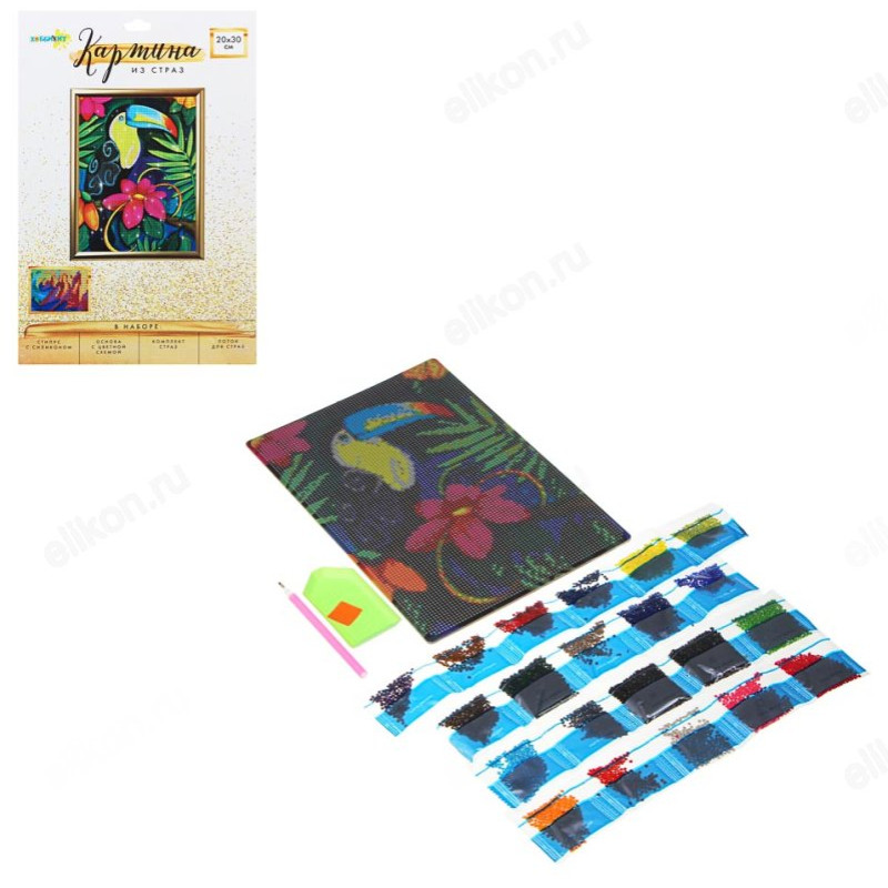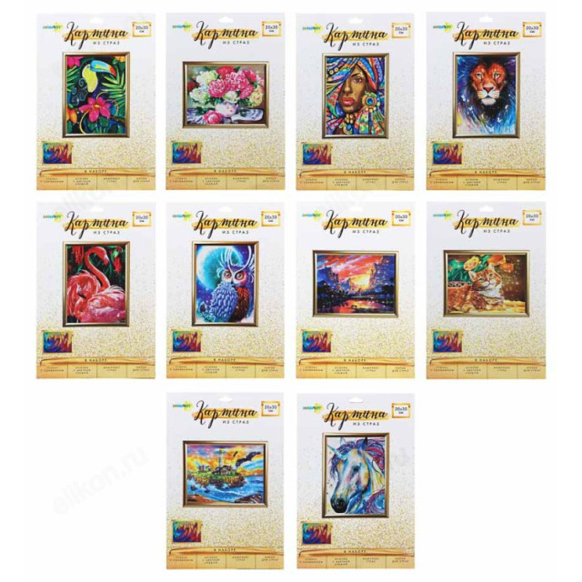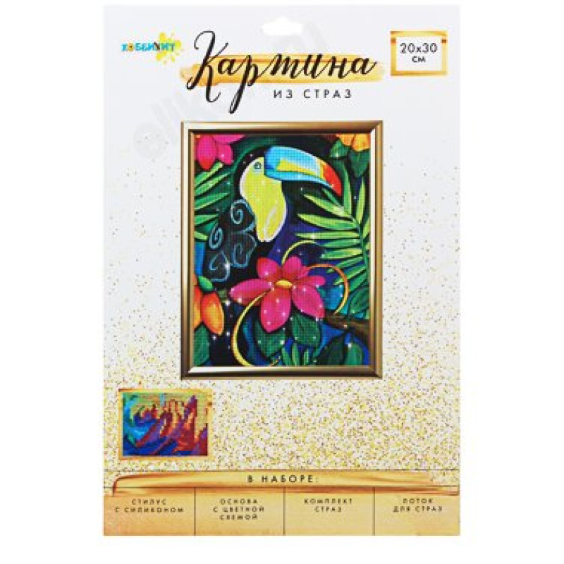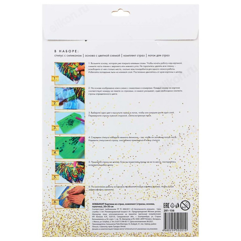 Набор содержит основу с цветной схемой, стилус, силикон для работы со стилусом, стразы, мольберт. Чтобы сделать аппликацию, необходимо выложить стразы согласно цветной схеме. На пакетиках со стразами написан номер цвета, чтобы увидеть, какой буквой он обозначен на картине, необходимо посмотреть таблицу на обороте основы. С помощью этого творческого набора дети смогут создать уникальную и яркую картину из страз!