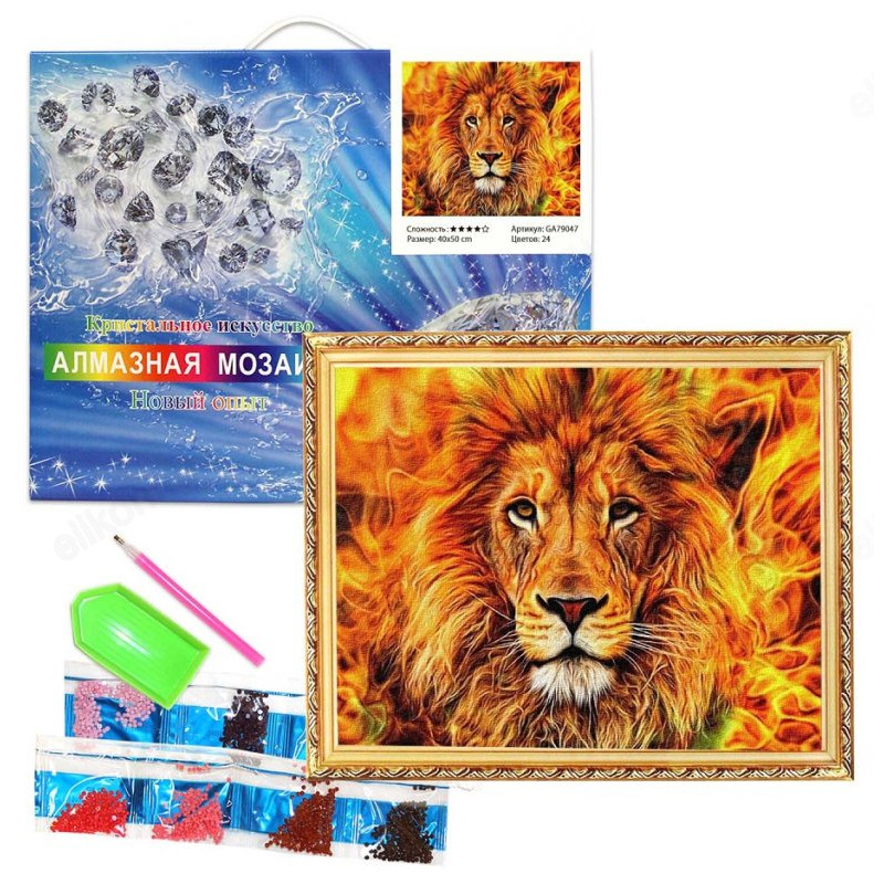 Набор для алмазной живописи с изображением льва включает все необходимое для создания картины в технике алмазной мозаики. Это удивительно просто и невероятно красиво. Для того чтобы создать шедевр, не нужны никакие художественные навыки или дополнительные покупки — все уже входит в комплект. Просто откройте коробку, и магия творчества начнет разворачиваться в ваших руках. Завершенная картина, выполненная с использованием страз, выглядит потрясающе благодаря их граням и огранке. Такие произведения могут стать новым увлечением, отличным подарком на любой праздник и прекрасным элементом декора для вашего интерьера. Размер картины составляет 40x50 см.