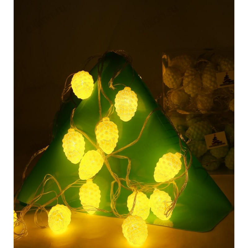 Гирлянды в виде шишек – это не только символ Нового Года и Рождества, но и незаменимый элемент для любого праздника, который невозможно представить без светового декора. Их можно использовать в повседневной жизни, и возможностей для применения гораздо больше, чем можно себе представить. Гирлянда прекрасно украсит комнатную елочку, гардины, окна или другие элементы интерьера, создавая атмосферу праздника, и станет ярким акцентом новогодней композиции, приятно удивляя гостей. Питание осуществляется от сети 220 В.