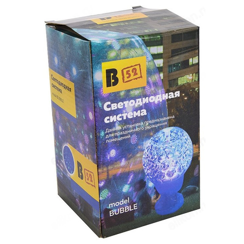 B52 BUBBLE - комнатная светодиодная система с абстрактной проекцией. Компактная, в форме шара на подставке. Излучает 3 цвета свечения: синий/красный/зеленый. Работает в автоматическом режиме.