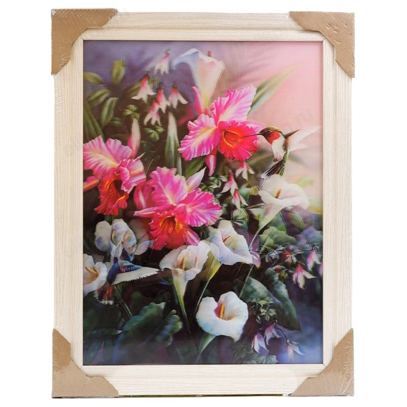 Картина, изменяющаяся в зависимости от угла обзора, наполнена экзотическими цветами и птицами. Наблюдение с разных ракурсов создает ощущение глубины, погружая зрителя в атмосферу произведения. Уникальная игра между передним и задним планом заставляет объекты трансформироваться и двигаться в зависимости от точки зрения, создавая эффект полного присутствия.