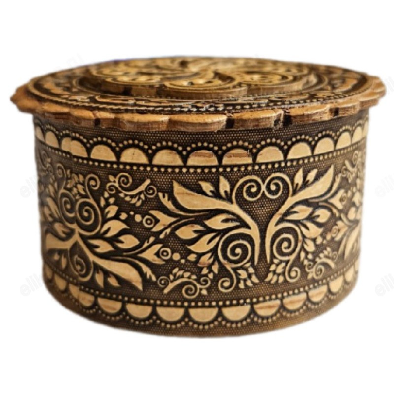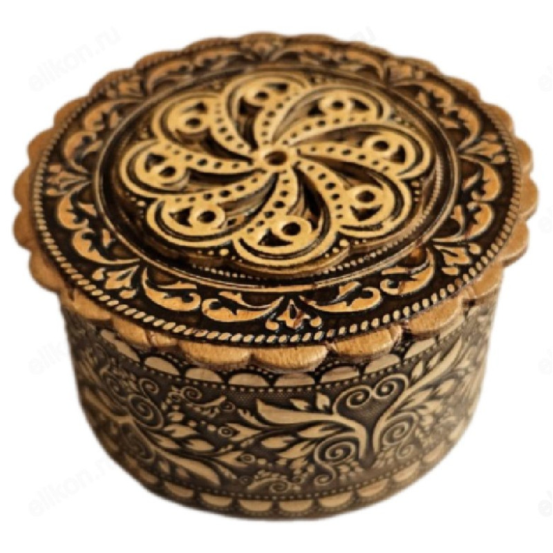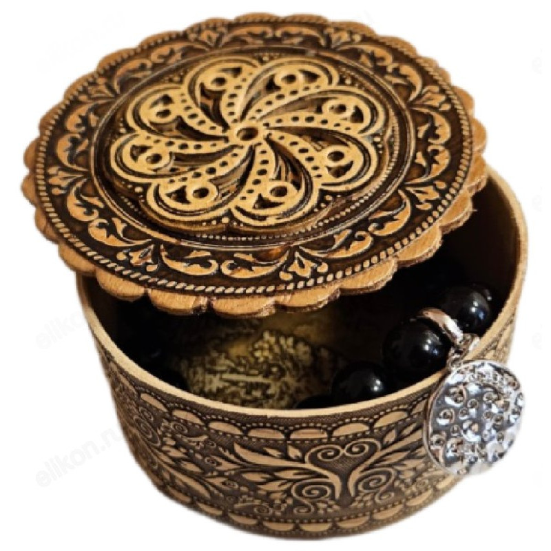 Маленькая круглая шкатулка, выполненная из бересты и шпона, имеет диаметр 6 см и высоту 3 см. Боковая часть украшена резьбой с изображением листьев и цветов, а на внутренней стороне дна и крышки также присутствует резьба по шпону с цветочными мотивами. Эта шкатулка идеально подходит для хранения мелких украшений, таких как кольца, кулоны и крестики. В неё можно положить крестик для крещения или обручальные кольца для венчания. Кроме того, в шкатулке можно хранить ладан, бисер и другие мелкие предметы.