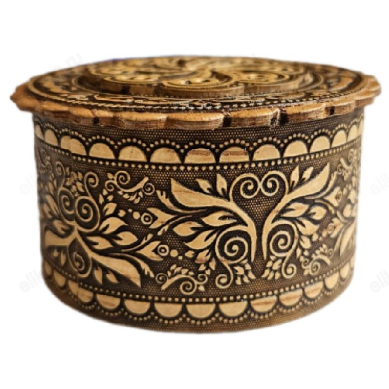 Небольшая круглая шкатулка, изготовленная из бересты и шпона, имеет диаметр 8 см и украшена резьбой с изображениями листьев и цветов. Она прекрасно подходит для хранения мелких украшений, таких как кольца, кулоны и крестики. В шкатулку можно положить крестик для крещения или обручальные кольца для венчания. Также в ней можно хранить ладан, бисер и другие мелкие предметы.