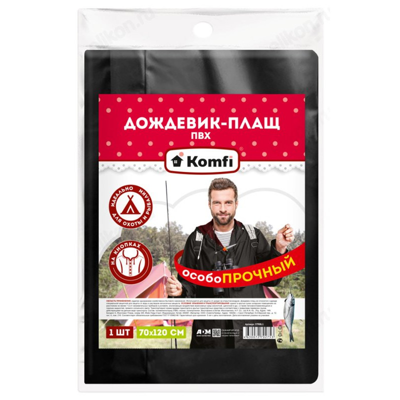 Прочный дождевик универсального размера. Отлично подходит для защиты от осадков. Имеет кнопки и капюшон для надежной защиты. Подходит для многоразового применения.