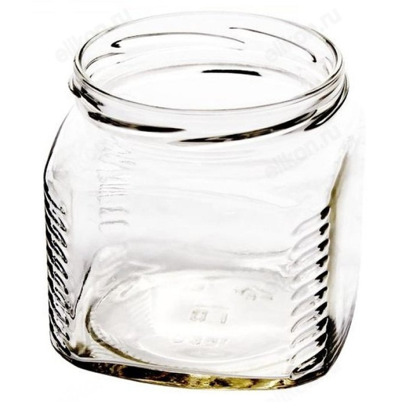 Необычная стеклобанка в форме рифленого кубика имеет 81 мм высоты с диаметром горловины в 66 мм.