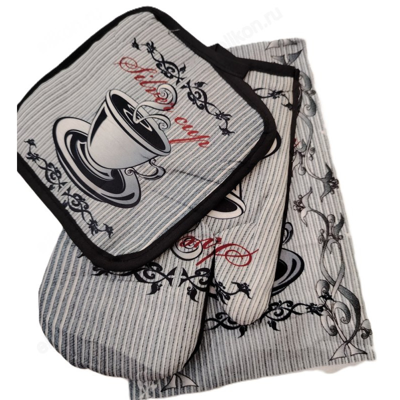 Прихватки и полотенце красиво и современно смотряться в интерьере любой кухни.