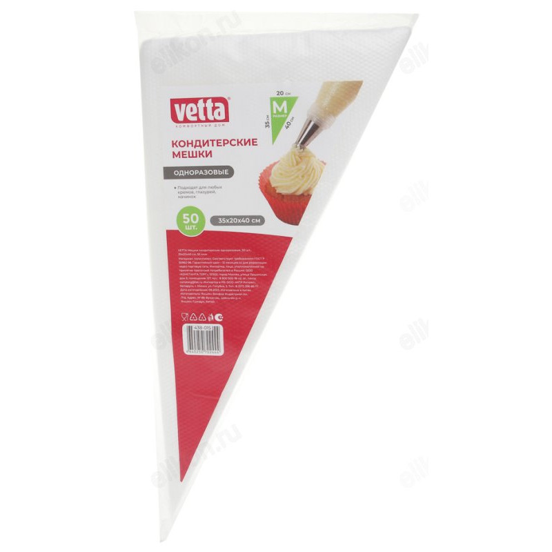 Кондитерские мешки - отличный помощник на кухне, подходят для работы с кремом, глазурью, шоколадом и т.п. Если вы часто балуете близких тортами и различными десертами с кремом, то вам просто необходим кондитерский мешок. Кондитерские мешки универсальны, их можно использовать с любыми кондитерскими насадками (уголок мешка обрезается под размер насадки). С помощью этого мешка 35x20x40 см украшение десертов доставит вам только удовольствие. Комплект состоит из 50 одноразовых пакетов.