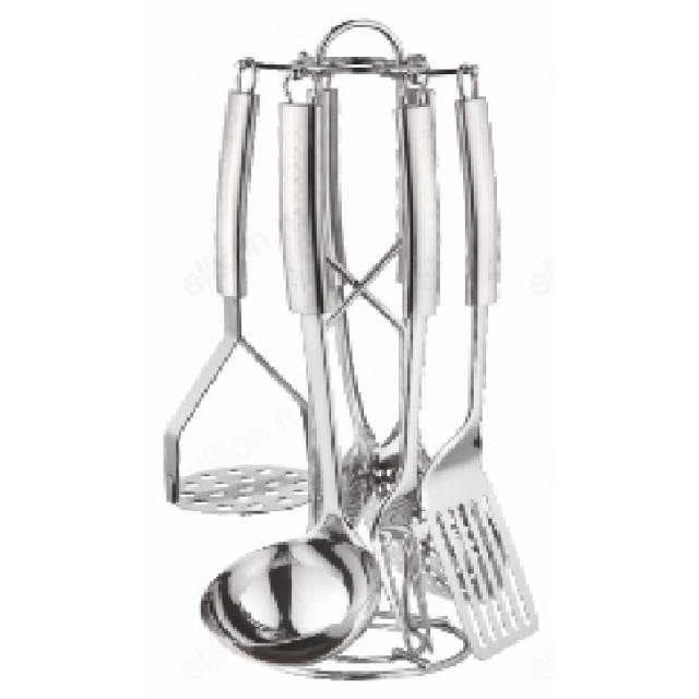 Состав набора: стойка для хранения, половник, вилка, шумовка, лопатка с прорезями, ложка, пресс для картофеля.