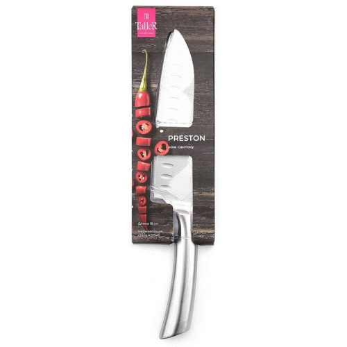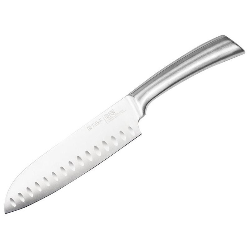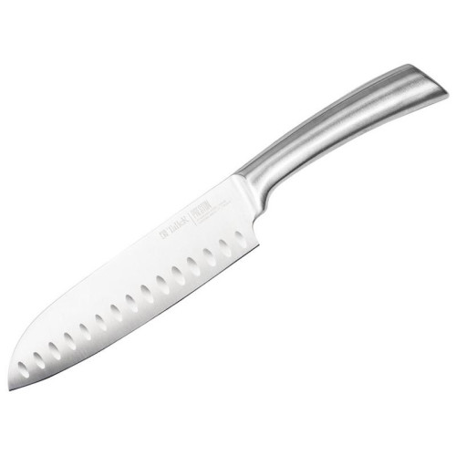 Сантоку, толщина лезвия 2.5мм,ширина лезвия 4.5мм, лезвие коррозионная сталь, ручка нерж.сталь, рекомендуется ручная мойка, упаковка картонная коробка