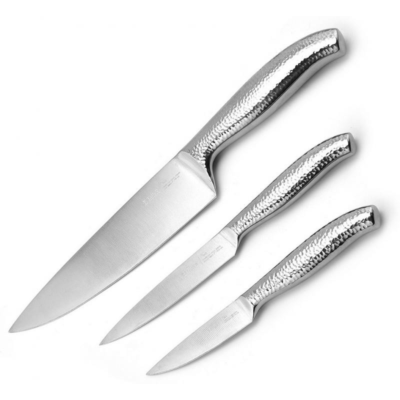 3 предмета, рукоятки-легированная сталь, лезвия- нерж.сталь, 3 ножа:поварской-20см, универсальный-12.5см, нож для чистки-8.5см, упаковка-блистер, рекомендуется ручная мойка