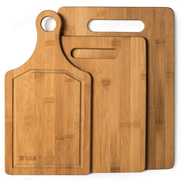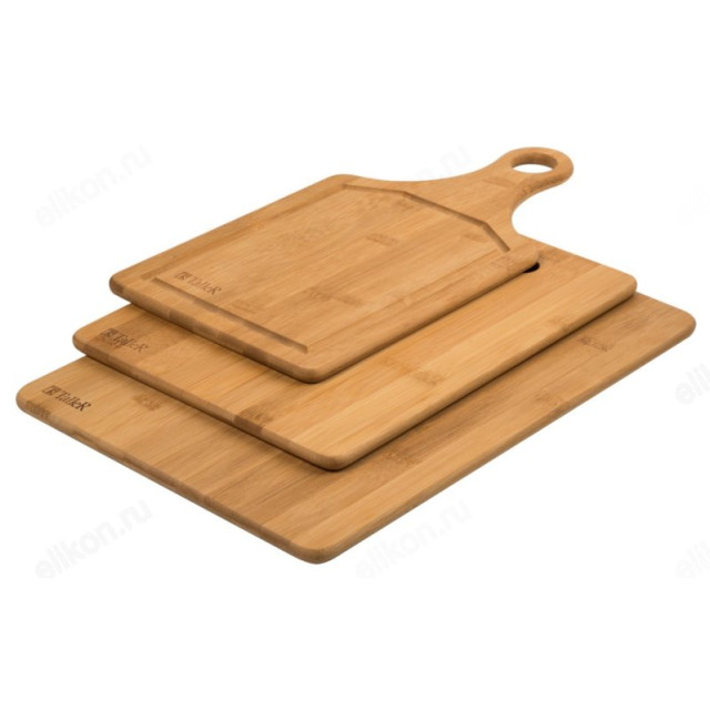 В комплекте представлено три доски, одна из которых оснащена специальным желобком по периметру, предотвращающим стекание сока с продуктов на стол.