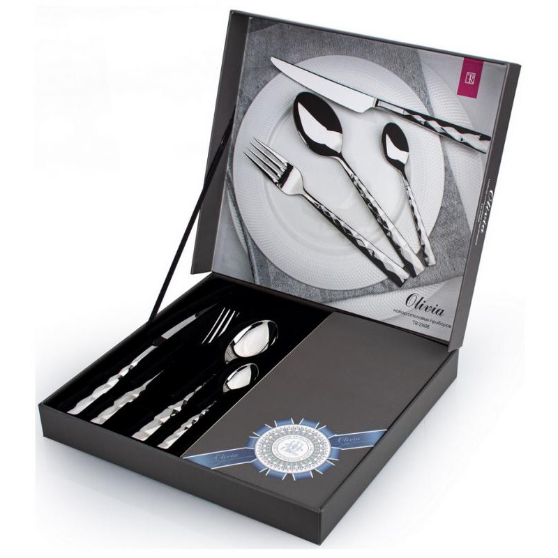 16 предметов, нерж. сталь:4 ложки столовые 20.5см, 4 вилки20.5см, 4 ложки чайные-14см, 4 ножа(легированная сталь)24см, подарочная упаковка