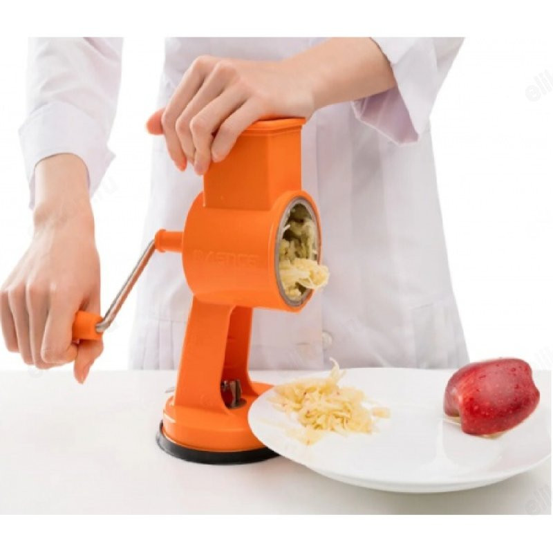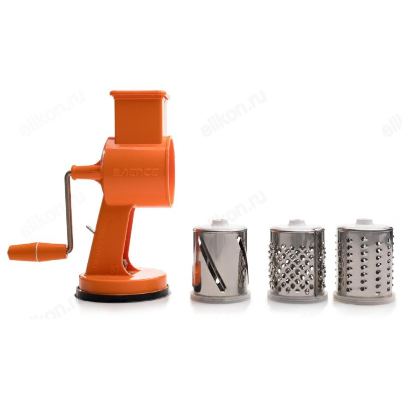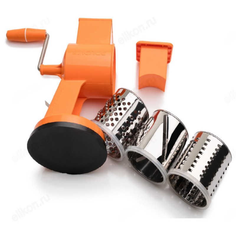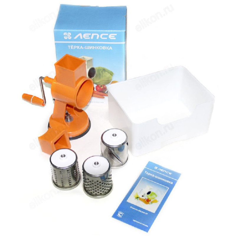 Состоит из корпуса, 3-х сменных барабанов, толкателя, ёмкости для измельченных продуктов.
