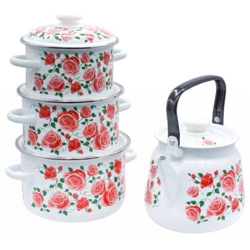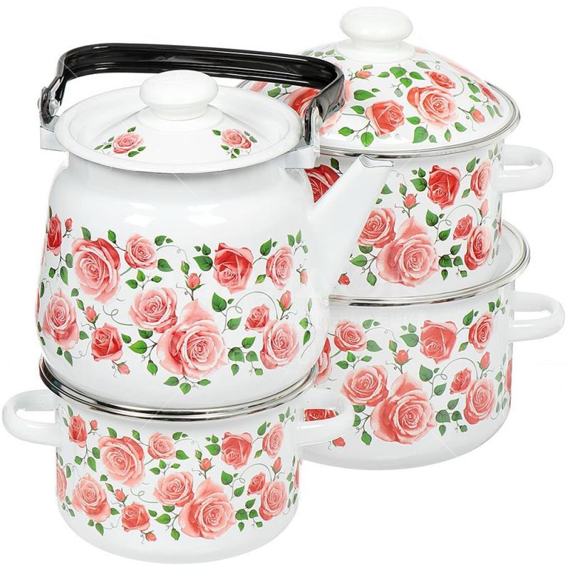 Набор кастрюль Роза плетистая цилиндр., белый эмал., деколь на крышке кастрюли ЭМАЛЬ (СИБ.ТОВАРЫ) N27B88