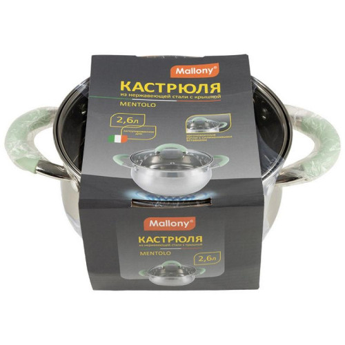 Кастрюля MENTOLO (2.6л) из нерж.стали с крышкой, ручки с силиконом MALLONY 103576
