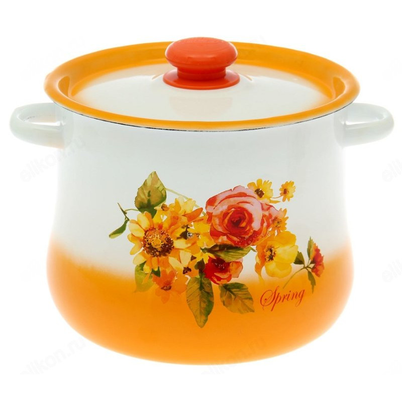 Эмалированная кастрюля грушевидной формы с крышкой. Металлическая крышка с пластиковой ручкой-кнопкой.