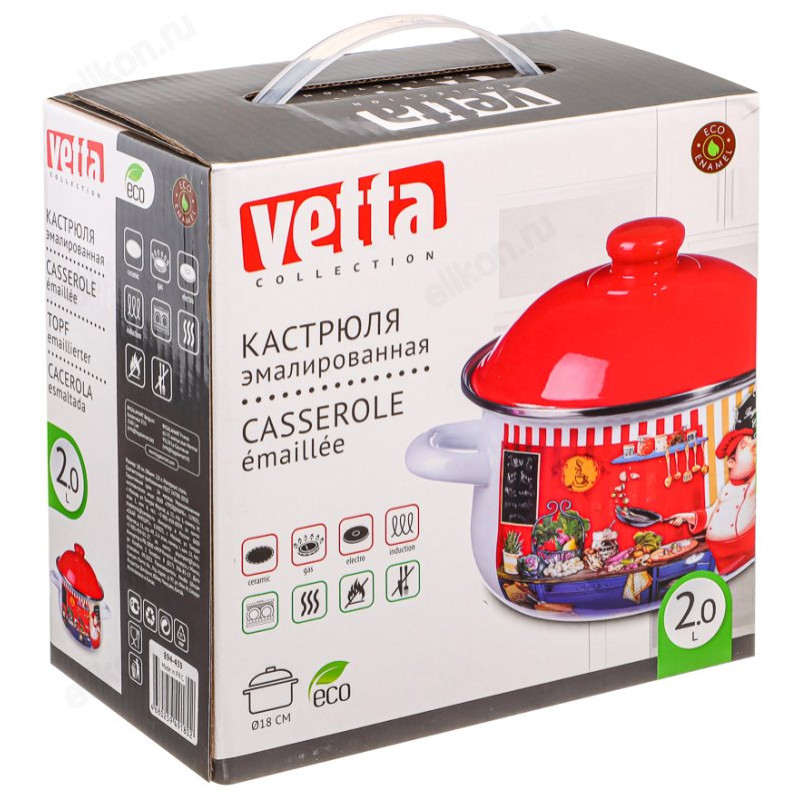 Нужна безопасная, качественная и красивая посуда для кухни? Эмалированная кастрюля Vetta Повар отвечает всем заявленным критериям. Идеально гладкая поверхность легко очищается от загрязнений, исключает размножение бактерий. В такой емкости можно хранить первые и вторые блюда. Приготовленный суп не пропитается запахом металла и не испортится. 5 причин купить эмалированные кастрюли Vetta Повар: варите на всех типах плит, включая индукцию; Объём — 2 литра, диаметр — 18 см — отличный выбор для 1-2 порций; можно ставить в духовой шкаф при температуре до 200°