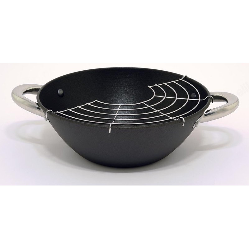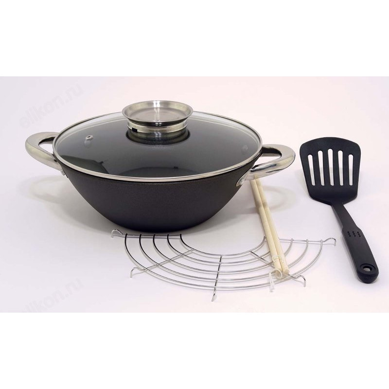 Казан объемом 3 л с антипригарным покрытием изнутри и краской черного цвета снаружи, с не нагревающимися ручками из нержавеющей стали, укомплектованный стеклянной крышкой с пароотводом внешней посадки, съемной решеткой из нержавеющей стали.
