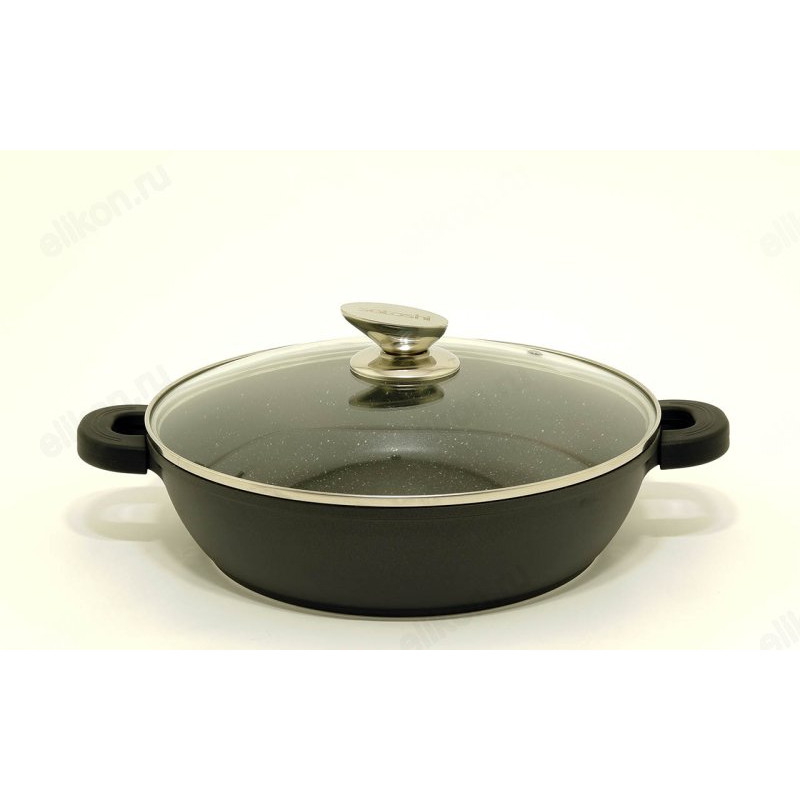 Сотейник диаметром 28 см из литого алюминия с2-х слойным антипригарным покрытием Мрамор изнутри и краской черного цвета снаружи, с силиконовыми накладками на ручки, подходит для всех типов плит, включая индукцию.