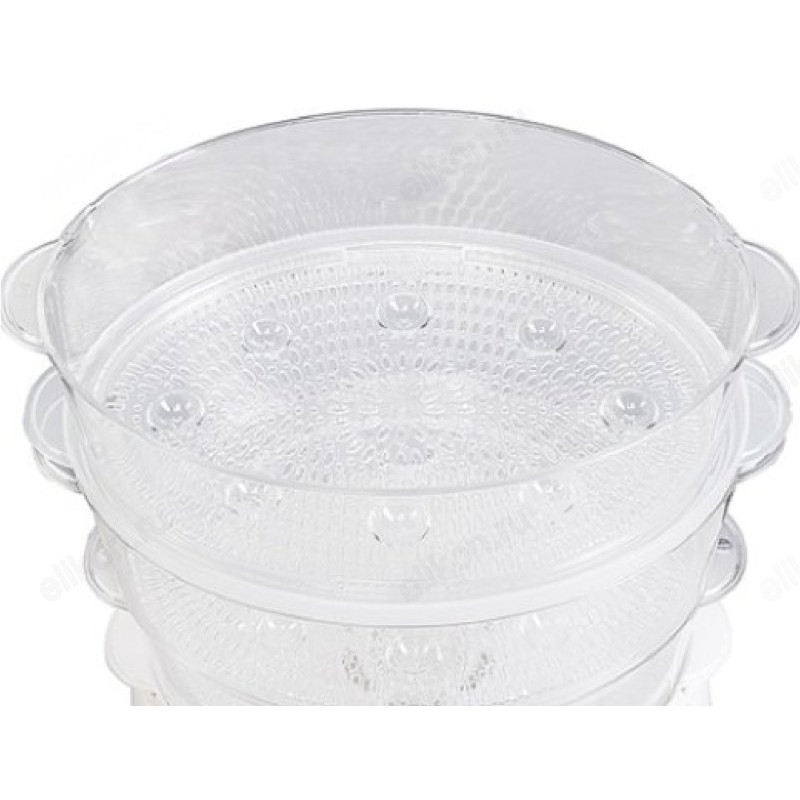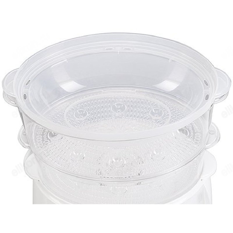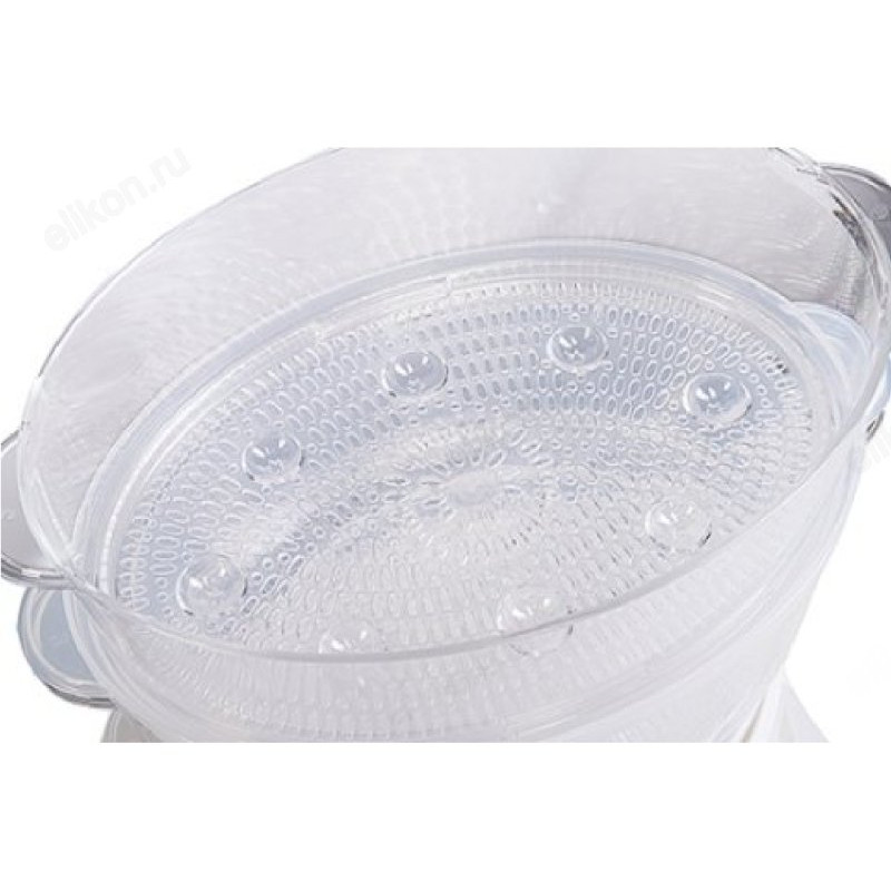 На трёх ярусах можно готовить одновременно несколько блюд, в дне каждого лотка расположены углубления для варки яиц.