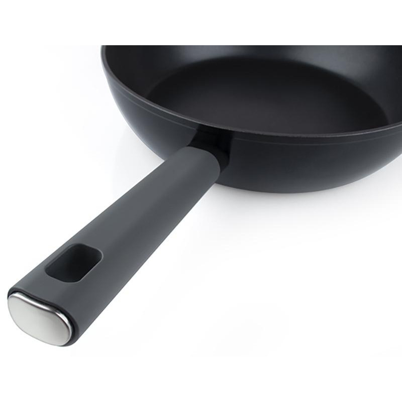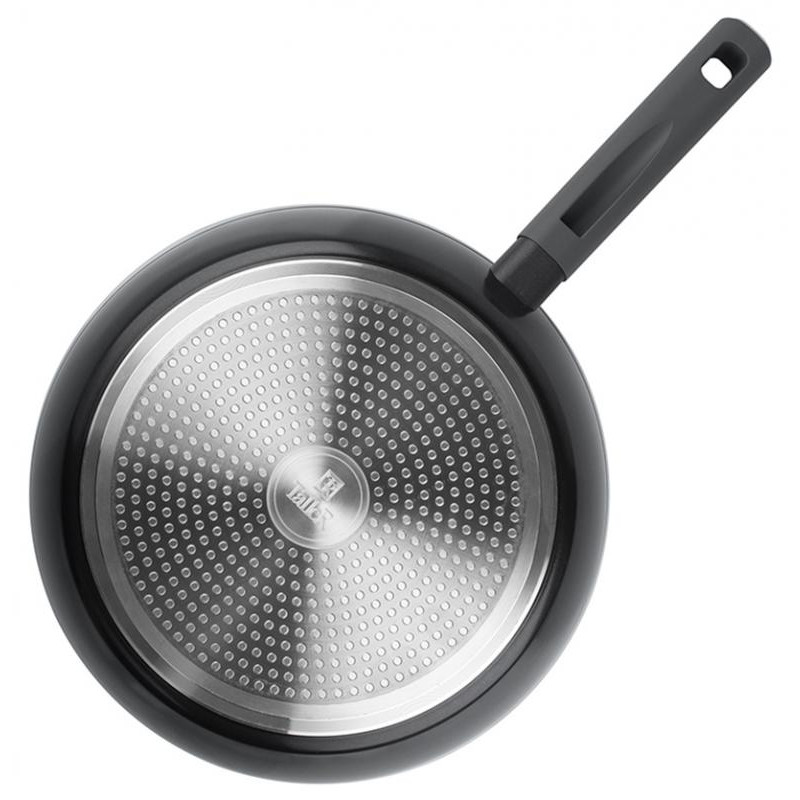 22см, высота 4.3см, алюминий (дно 3.3мм), толщина стенок 2.0мм, ручка бакелит, подходит для всех видов плит, можно мыть в посудомоечной машине без щелочных моющих средств