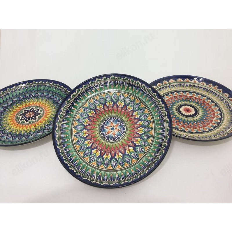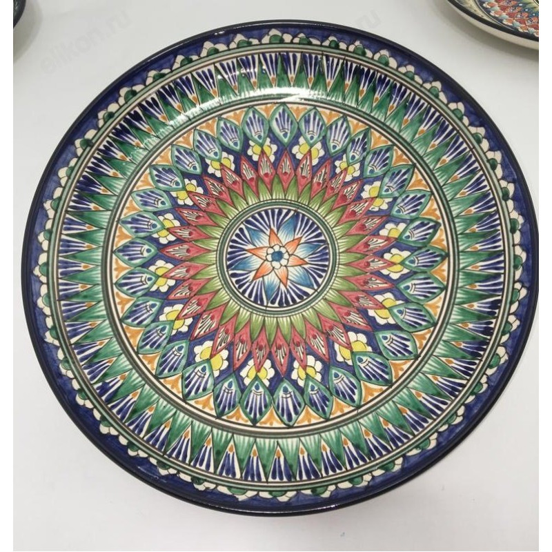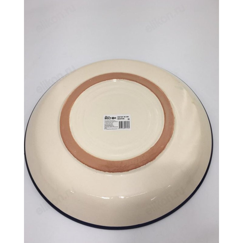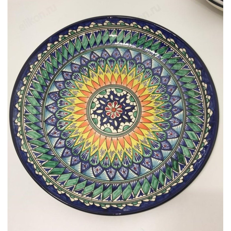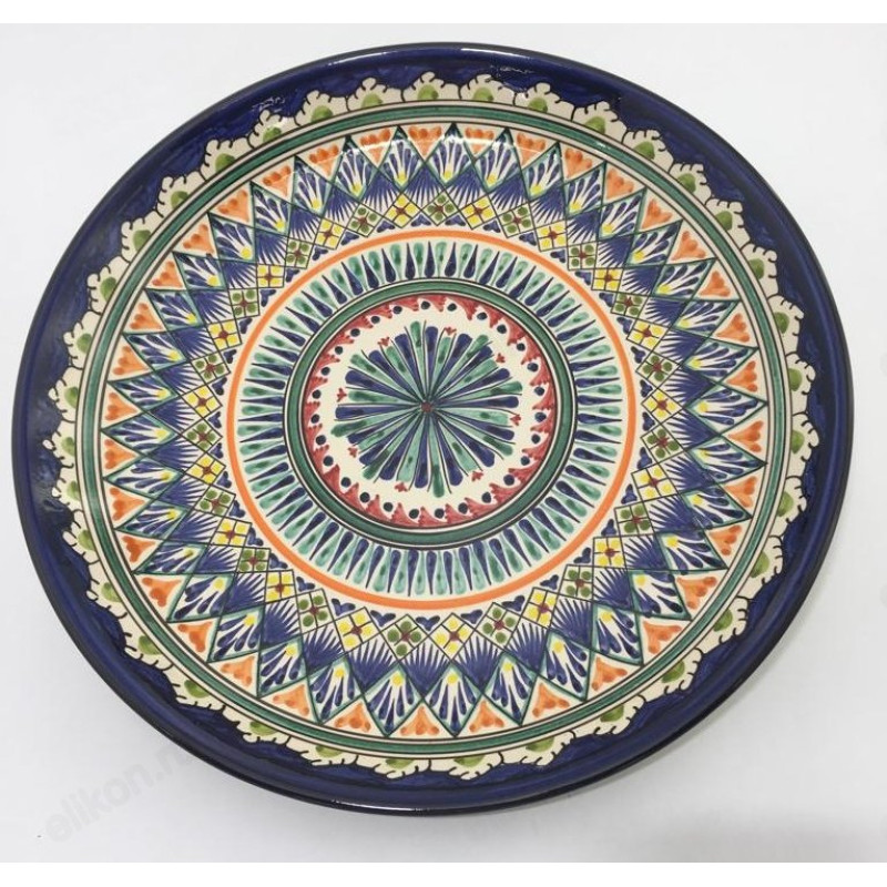 Лаган 38 сантиметров из Риштанской керамики украсит любой стол своим очаровательным видом. Оригинальные восточные узоры нанесённые вручную, посуда созданная руками человека. Лаган - большое блюдо для плова, шашлыка и др. Узоры на фото в реальности могут незначительно отличаться, т.к узоры ручной работы.