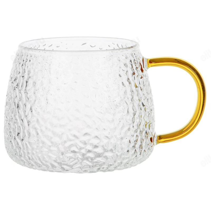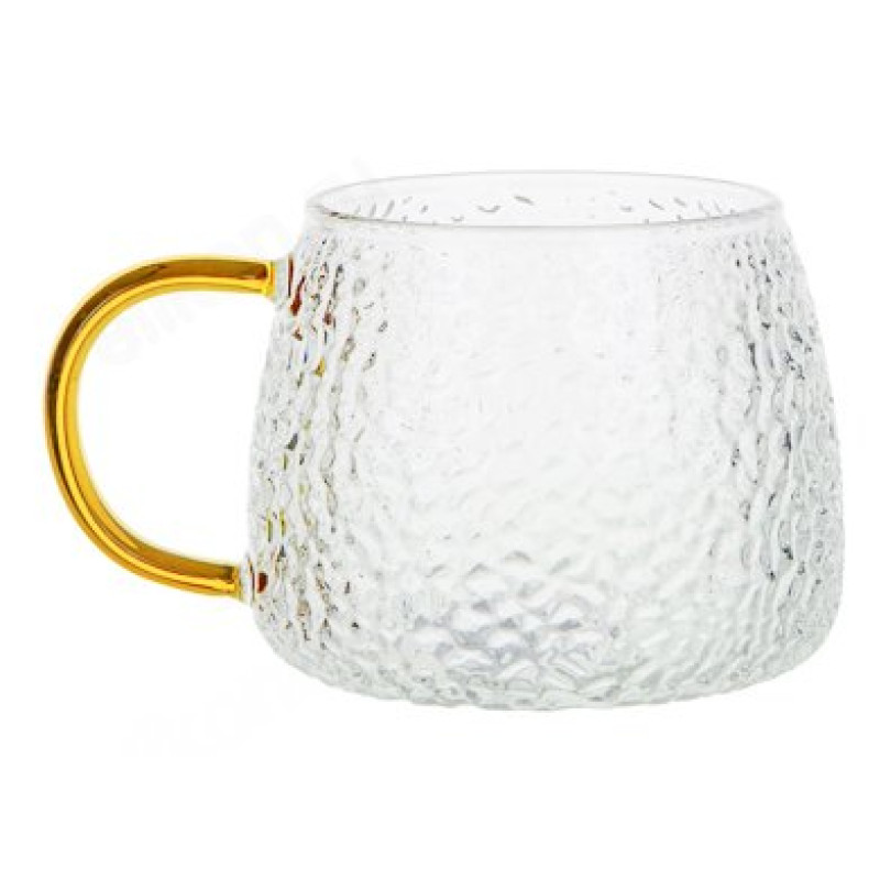 Стеклянная кружка с прозрачными рифлеными стенками и изящной золотой ручкой, будет отлично смотреться не только на праздничном столе, но украсит вашу трапезу в повседневной жизни. Горячие и холодные напитки в такой кружке смотрятся эффектно и торжественно. Выбирайте сами: яркий фруктовый чай, бодрящий капучино с пышной пенкой или горячий шоколад с маршмеллоу. В такой чашке любой напиток покажется вкуснее и ароматнее. Кружка изготовлена из прочного стекла и устойчива к перепадам температур, стеклянная ручка не нагревается. Яркий роскошный дизайн кружки поможет создать праздничную уютную атмосферу.