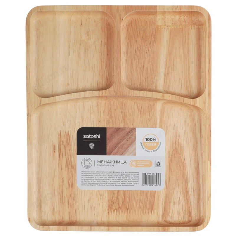 Менажница SATOSHI размером 25*20.5*1.5 см из гевеи украсит праздничный и повседневный стол и прекрасно подойдет для подачи сухих закусок, а также нарезок и фруктов на общий стол. Разделена на 3 отсека.