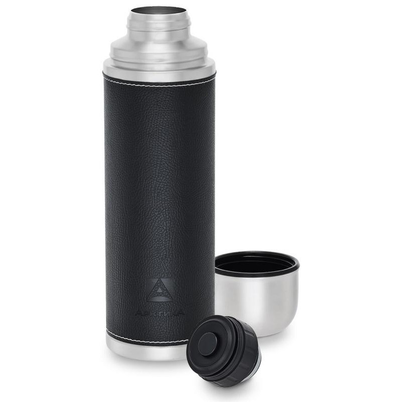 Термос для напитков, пробка с кнопкой, с кожаной вставкой на корпусе. Объем 1л