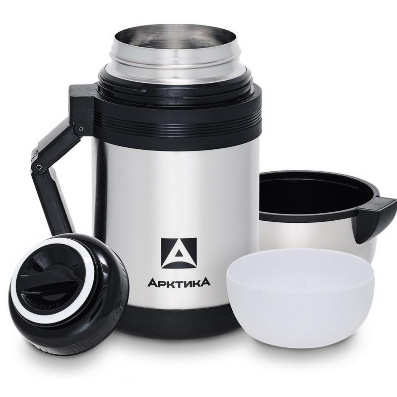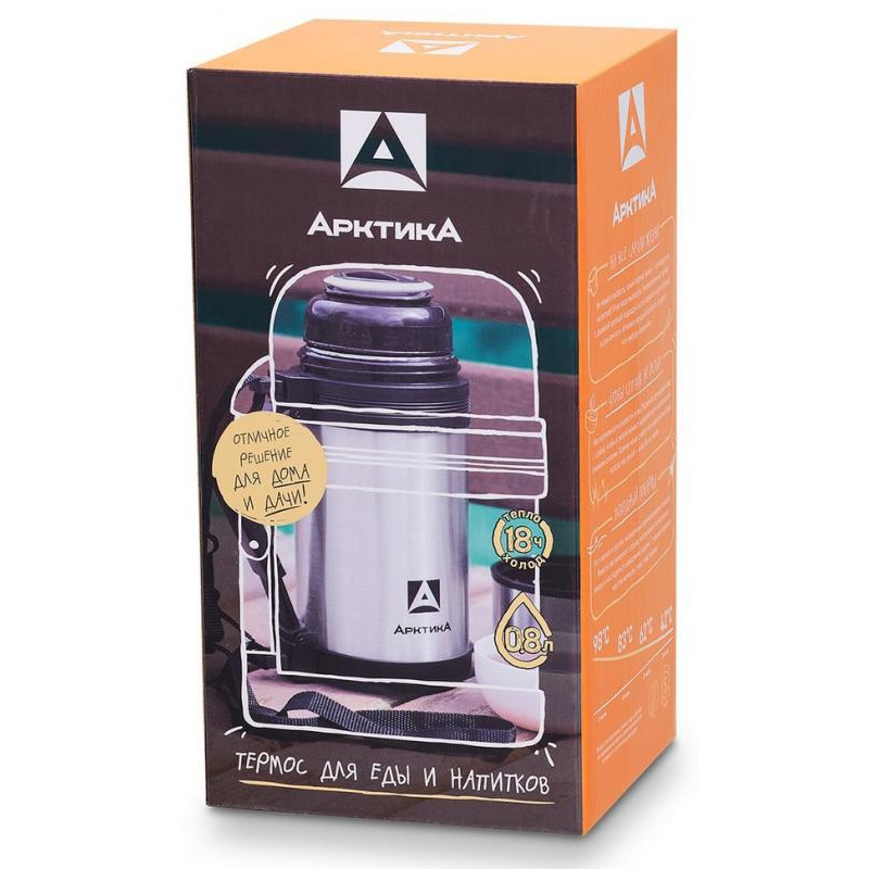 0.8л, с универсальной пробкой, для напитков и еды, в комплект входит дополнительная чашка и съемный ремешок для переноски, снабжен складной ручкой
