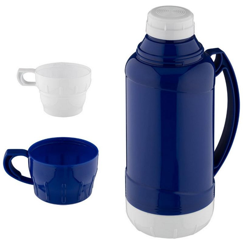 1.8л, пластик/стекло/силикон, ширина горлышка 3.5см, стеклянная колба с двойными стенками, 2 чашки в комплекте, цвет - синий