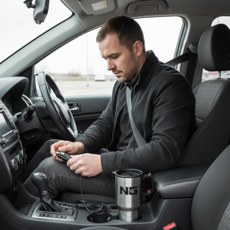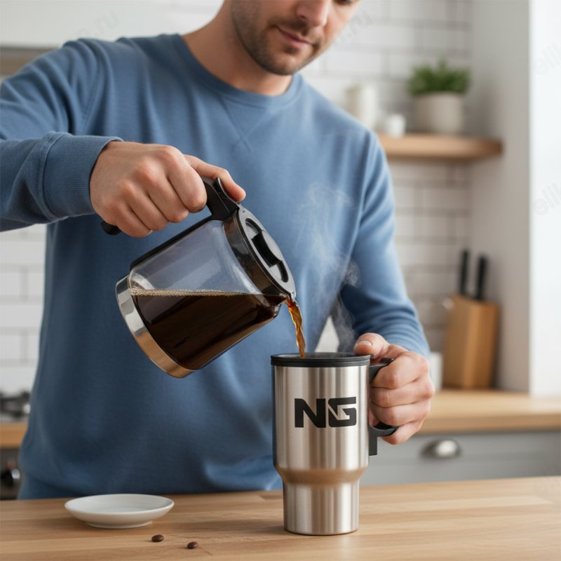 Автомобильная кружка с подогревом позволяет наслаждаться горячим кофе, чаем или супом прямо за рулем машины.