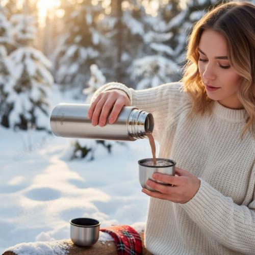 Термос снабжен практичной крышкой - чашкой для питья в количестве двух штук!