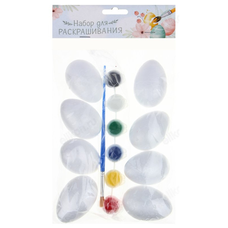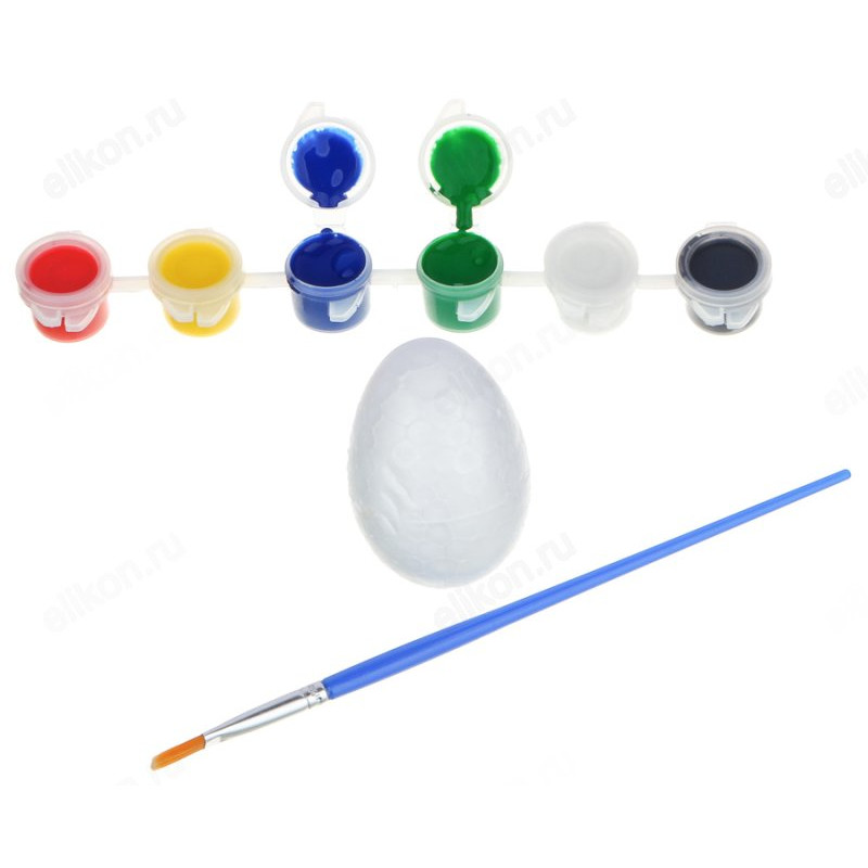 Пасхальный набор для раскрашивания с акриловыми красками – это 8 декоративных яиц из пенопласта, палитра красок из шести цветов и кисточка.