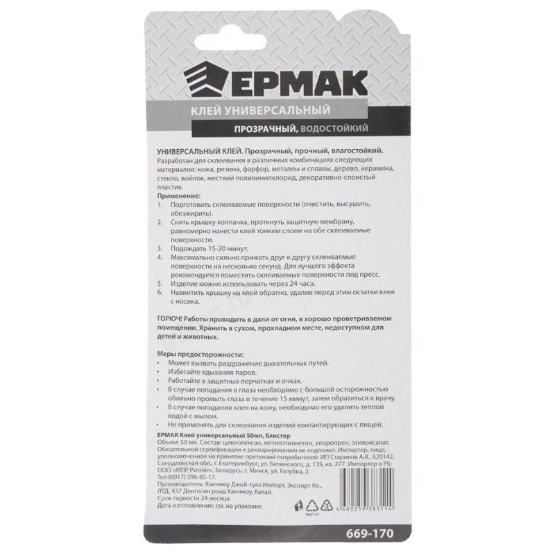 Моментальный универсальный, водонепроницаемый клей. Используется для моментального склеивания материалов в различных комбинациях: фарфор, металл, керамика, резина, кожа, дерево, картон, бумага, пластик, пробка.